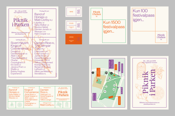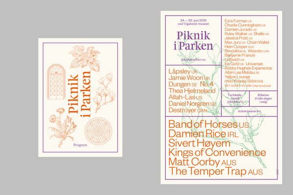 The identity for 2016 was inspired by the Vigeland Park itself. Plants and architectural decorations were used as illustrations, presented in grids reminiscent of parks portrayed from a bird’s-eye view.